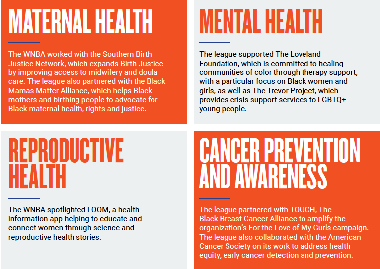The WNBA, WNBPA, teams and players dedicated the season to women’s health equity, working to bring awareness to some of the most critical health matters facing women — particularly women of color.