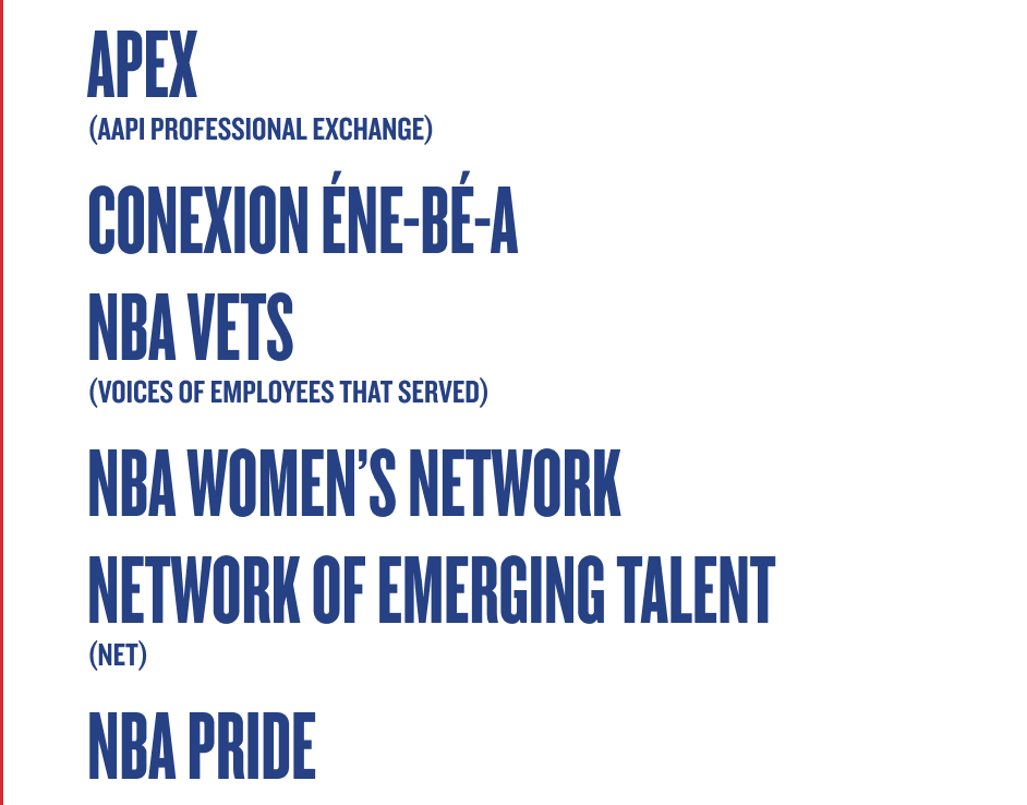 The NBA’s employee resource teams (ERTs) contribute directly to our strategy to drive business outcomes and an inclusive culture through community building. ERTs drive diversity and mitigate risk through efforts aimed at recruiting, retaining and advancing employees from underrepresented groups and allies. ERT co-chairs and members enhance their leadership mindset through stretch assignments, event organization and strategic planning.